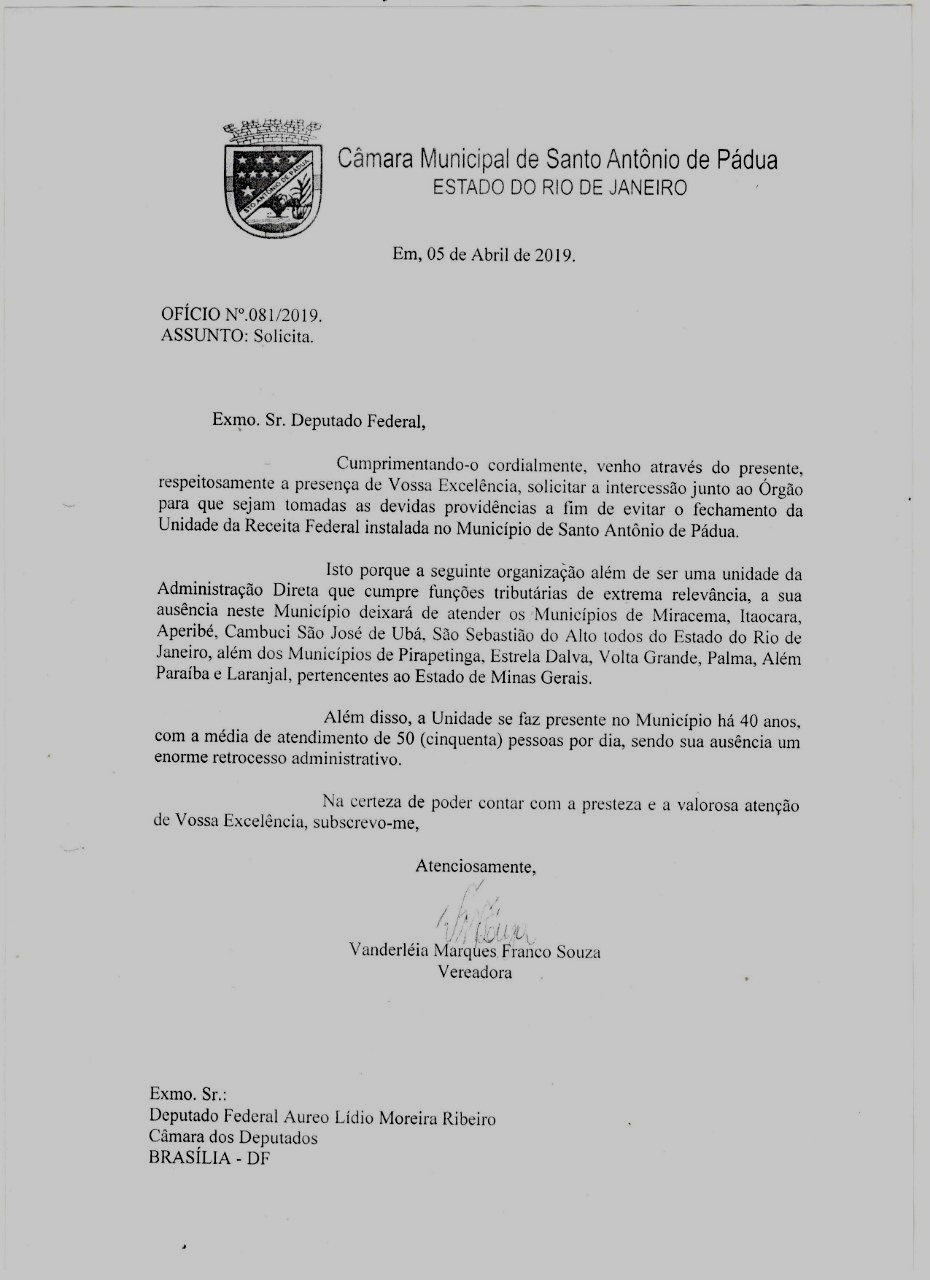 Oficio Enviado ao Deputado Federal Aureo